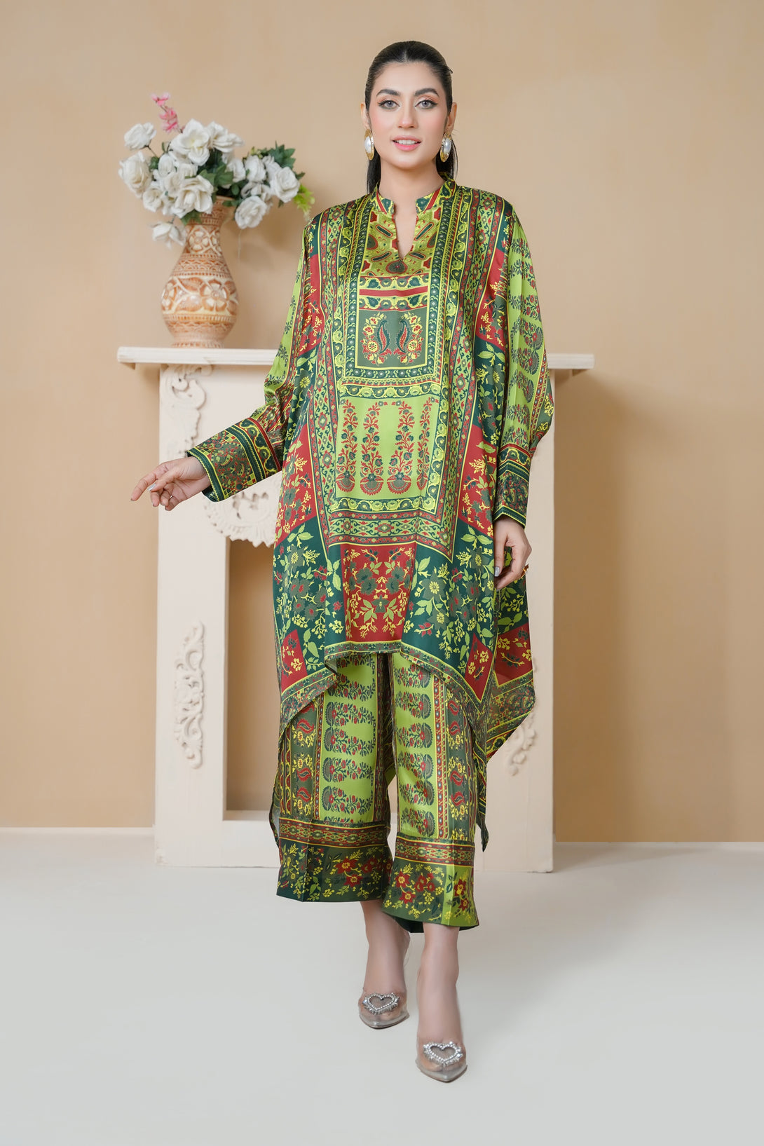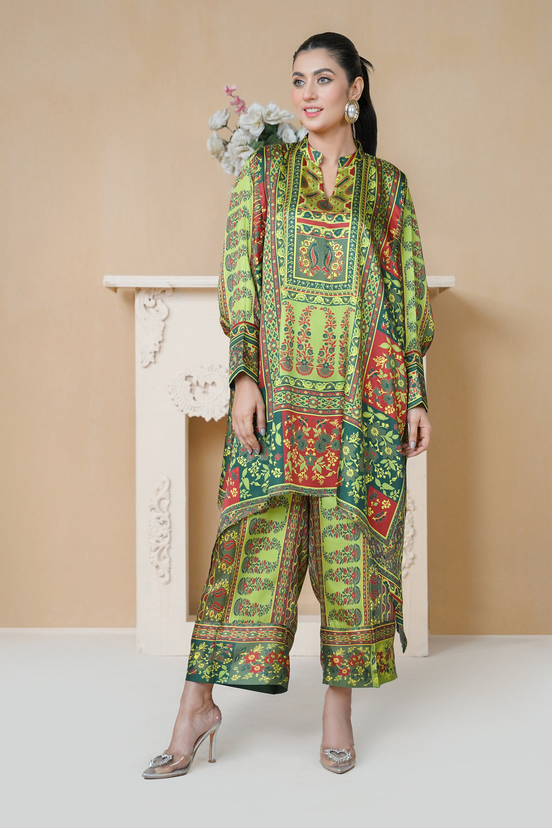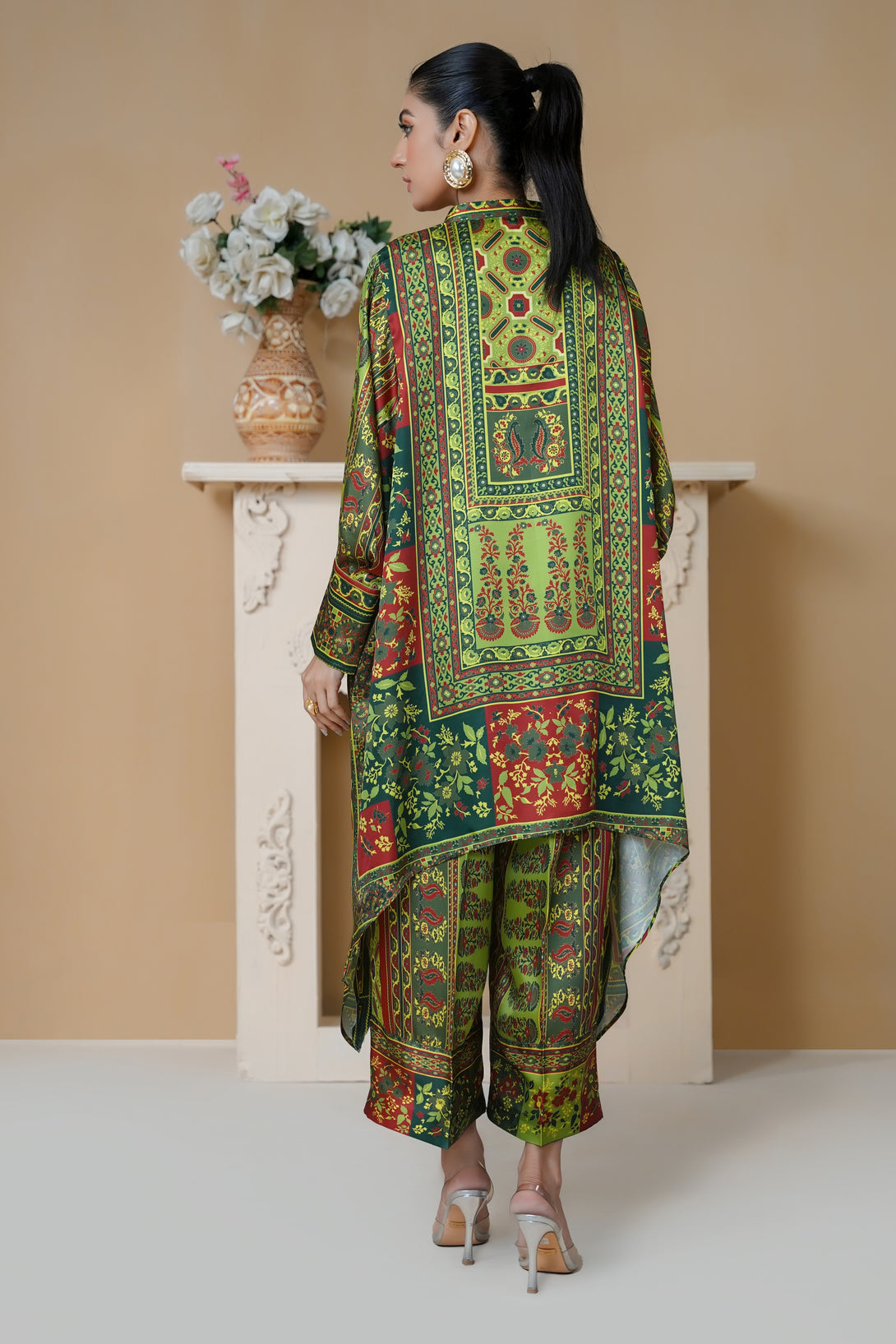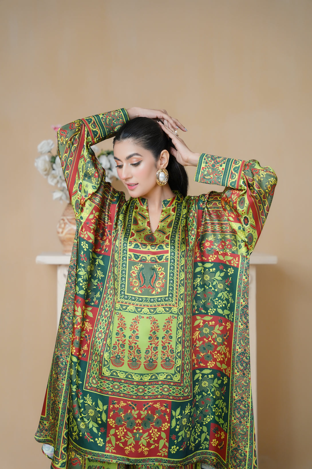This two-piece print suit is a vibrant ensemble featuring an intricate mix of floral and geometric patterns in shades of green, red, and gold. The loose-fitted tunic has a chic asymmetrical hemline and a modest V-neck, adding a touch of elegance to the design. Paired with wide-leg trousers that mirror the rich patterns of the top, this outfit is a perfect blend of comfort and contemporary style, ideal for festive or casual wear