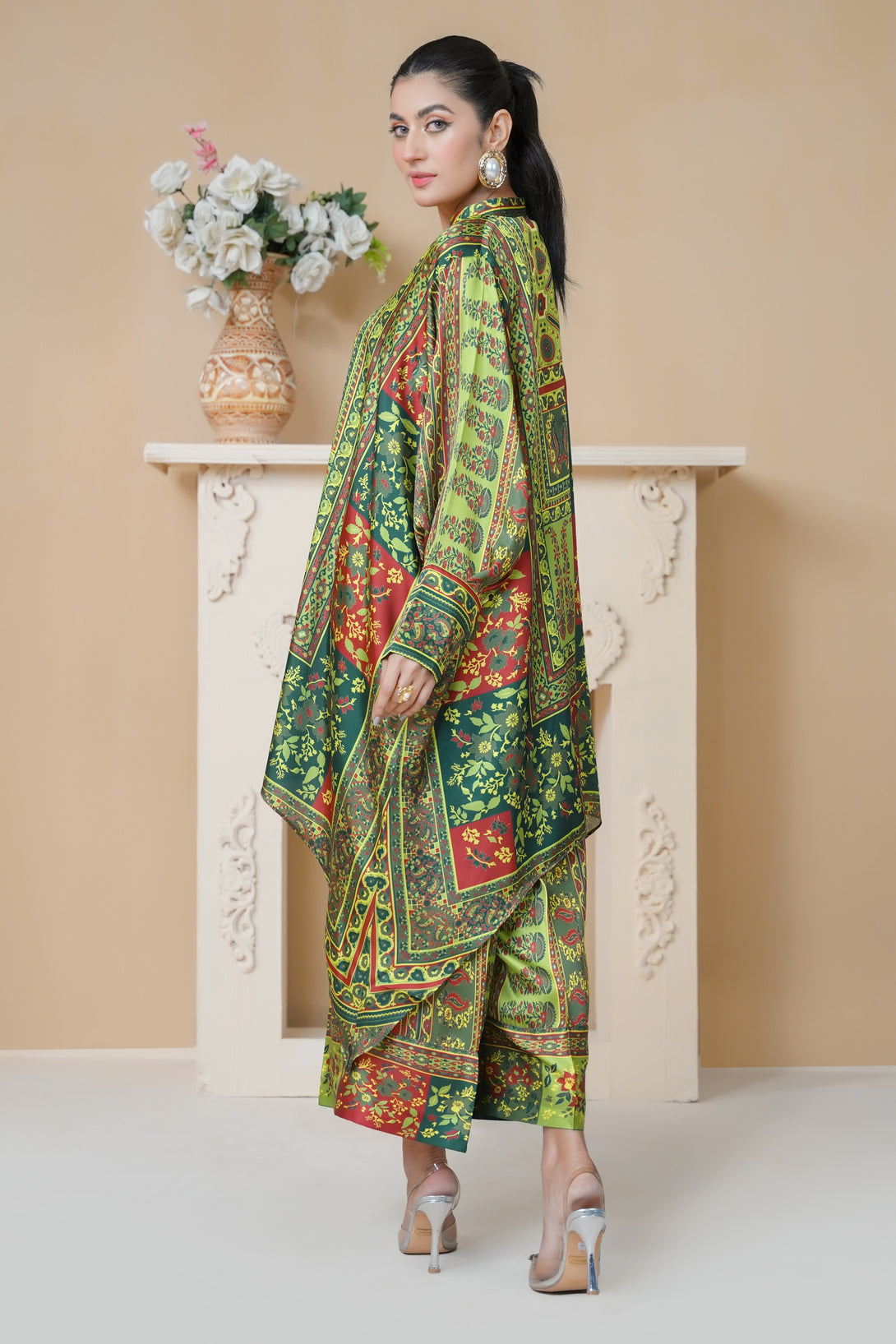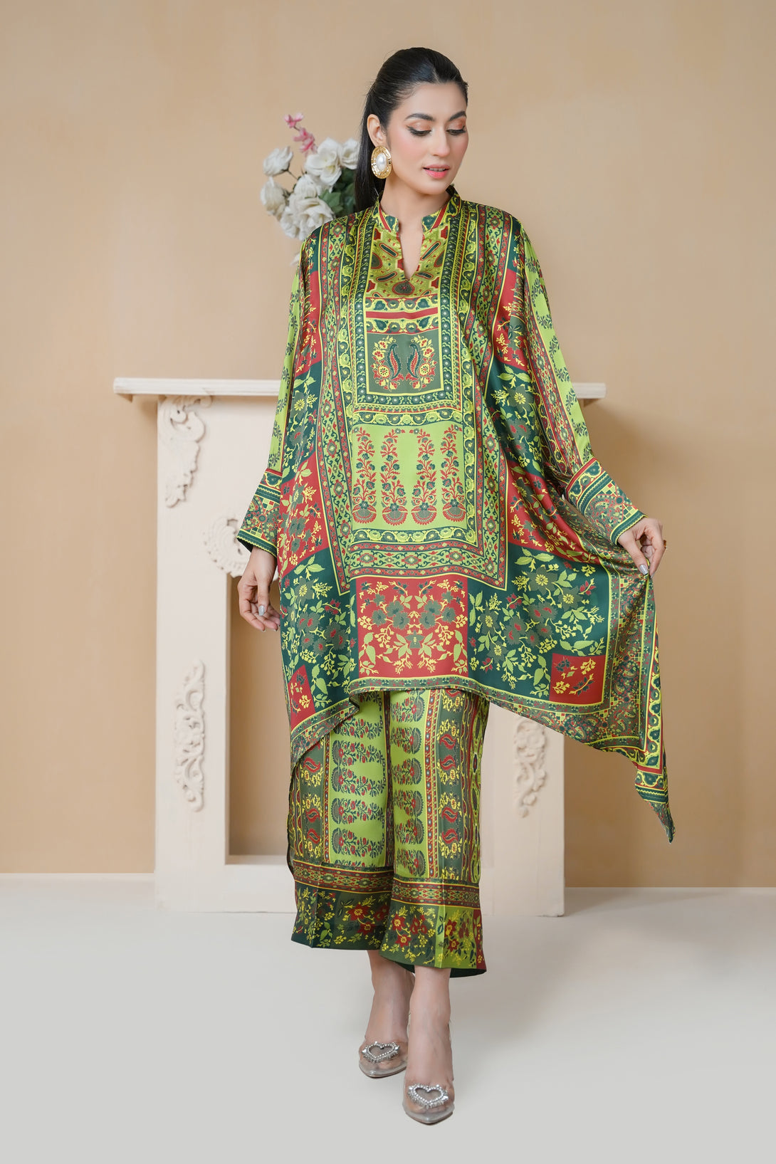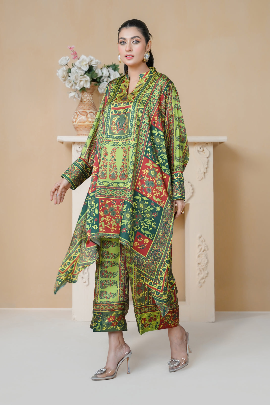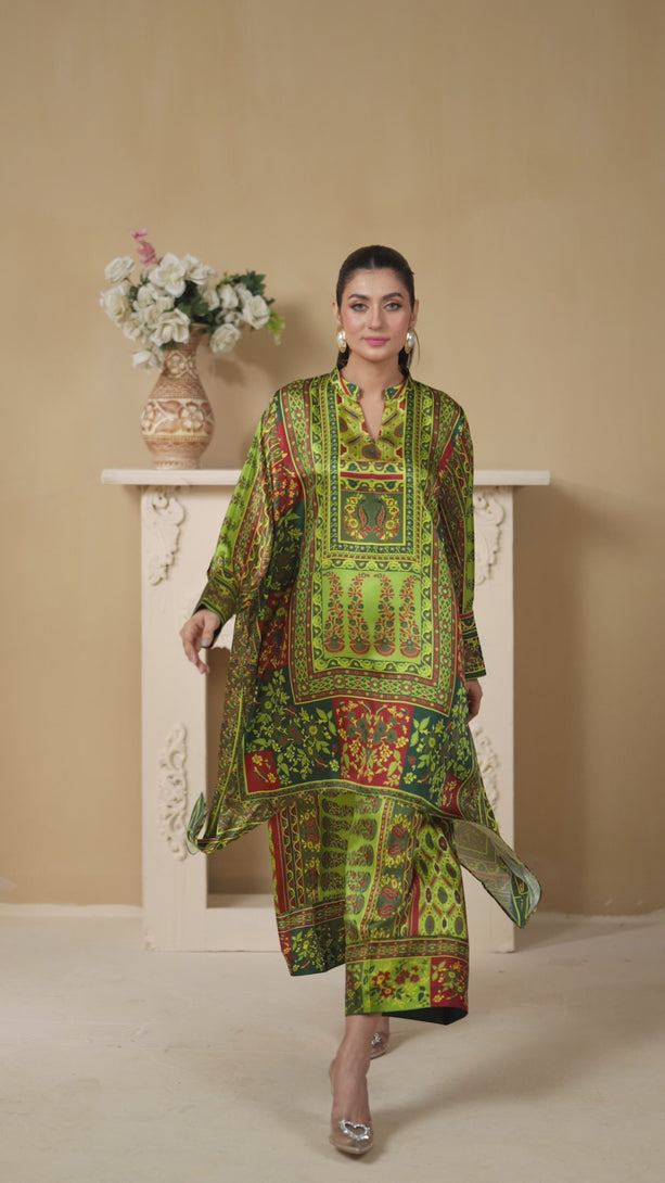 This two-piece print suit is a vibrant ensemble featuring an intricate mix of floral and geometric patterns in shades of green, red, and gold. The loose-fitted tunic has a chic asymmetrical hemline and a modest V-neck, adding a touch of elegance to the design. Paired with wide-leg trousers that mirror the rich patterns of the top, this outfit is a perfect blend of comfort and contemporary style, ideal for festive or casual wear