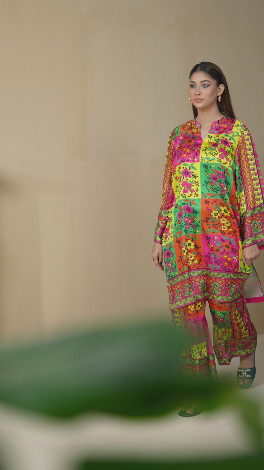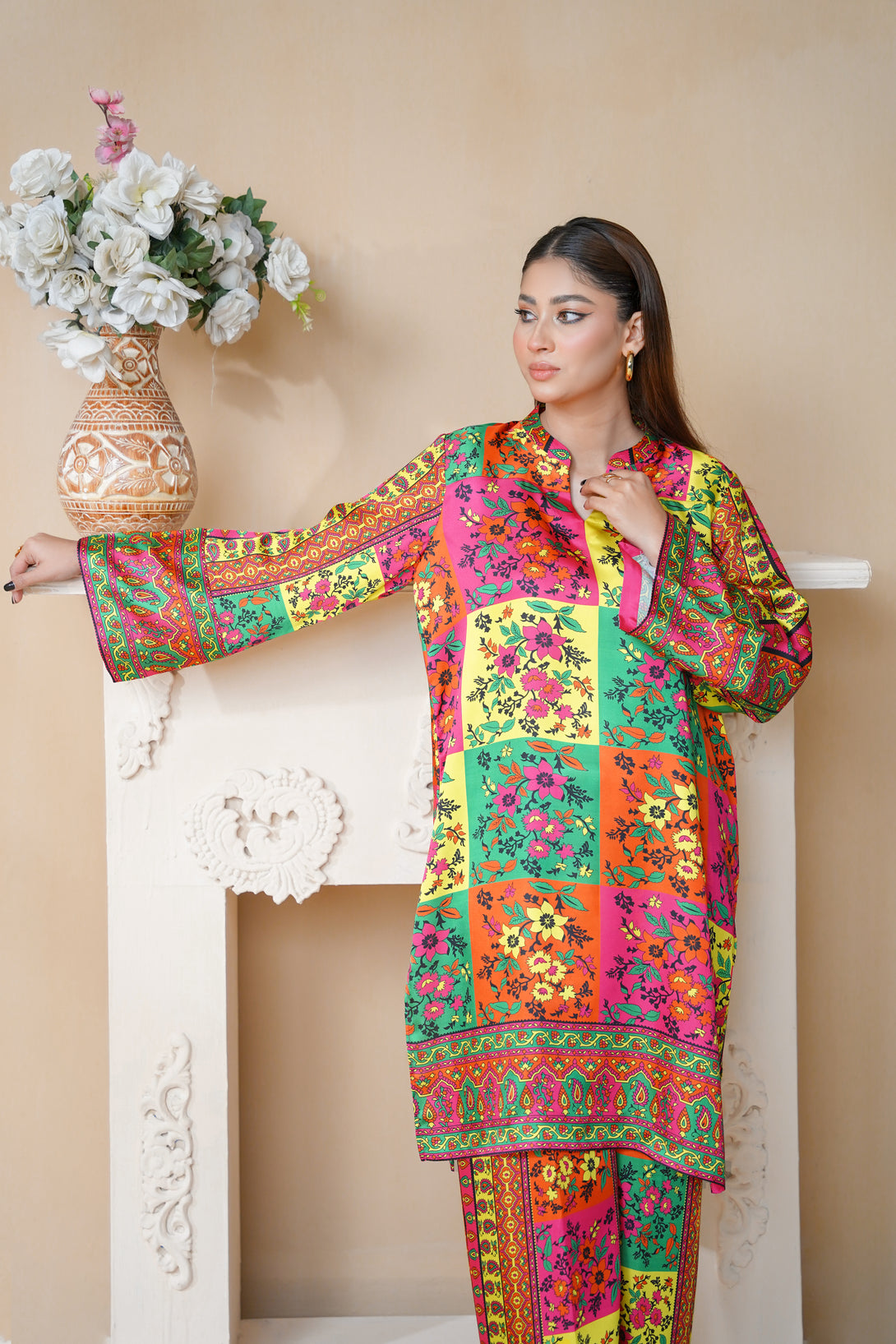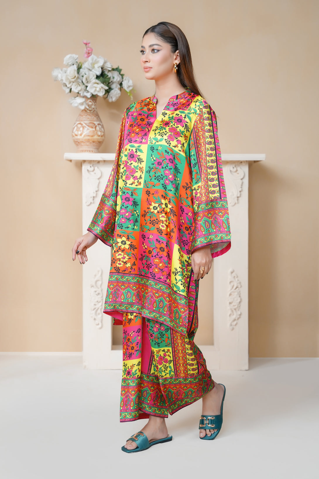 A graceful two-piece print outfit adorned with mesmerizing > patterns, making it a timeless choice. The tunic boasts a modest yet fashionable cut, with intricate details adding depth to the design. Complemented by matching trousers, this look is effortlessly chic and versatile
