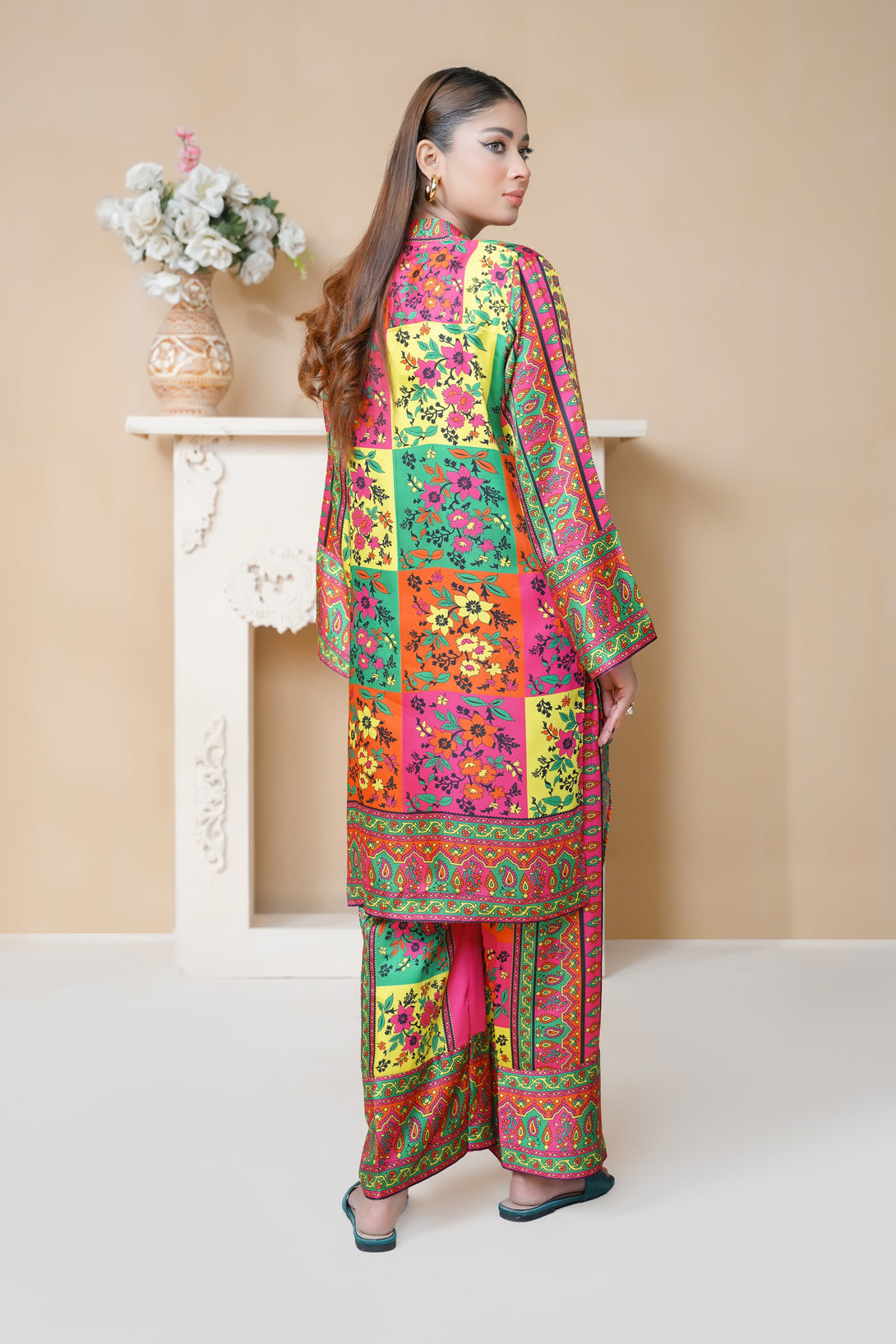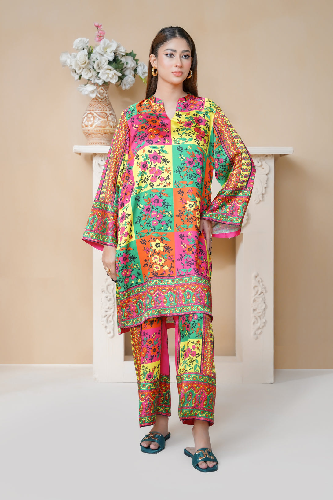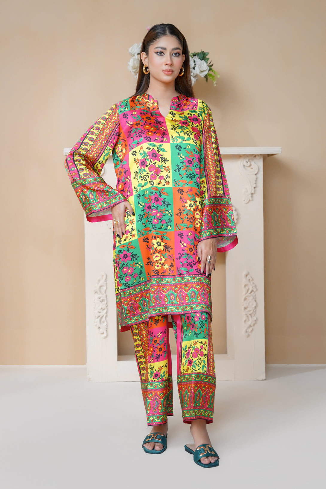 A graceful two-piece print outfit adorned with mesmerizing > patterns, making it a timeless choice. The tunic boasts a modest yet fashionable cut, with intricate details adding depth to the design. Complemented by matching trousers, this look is effortlessly chic and versatile