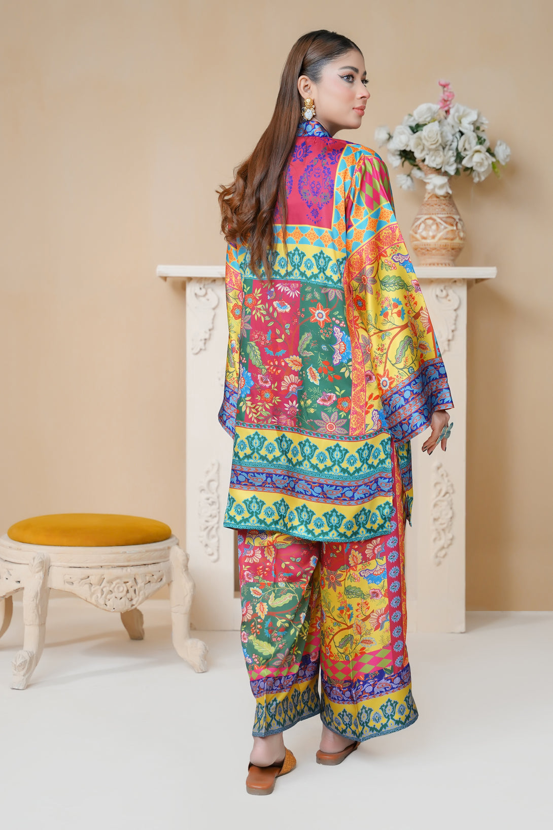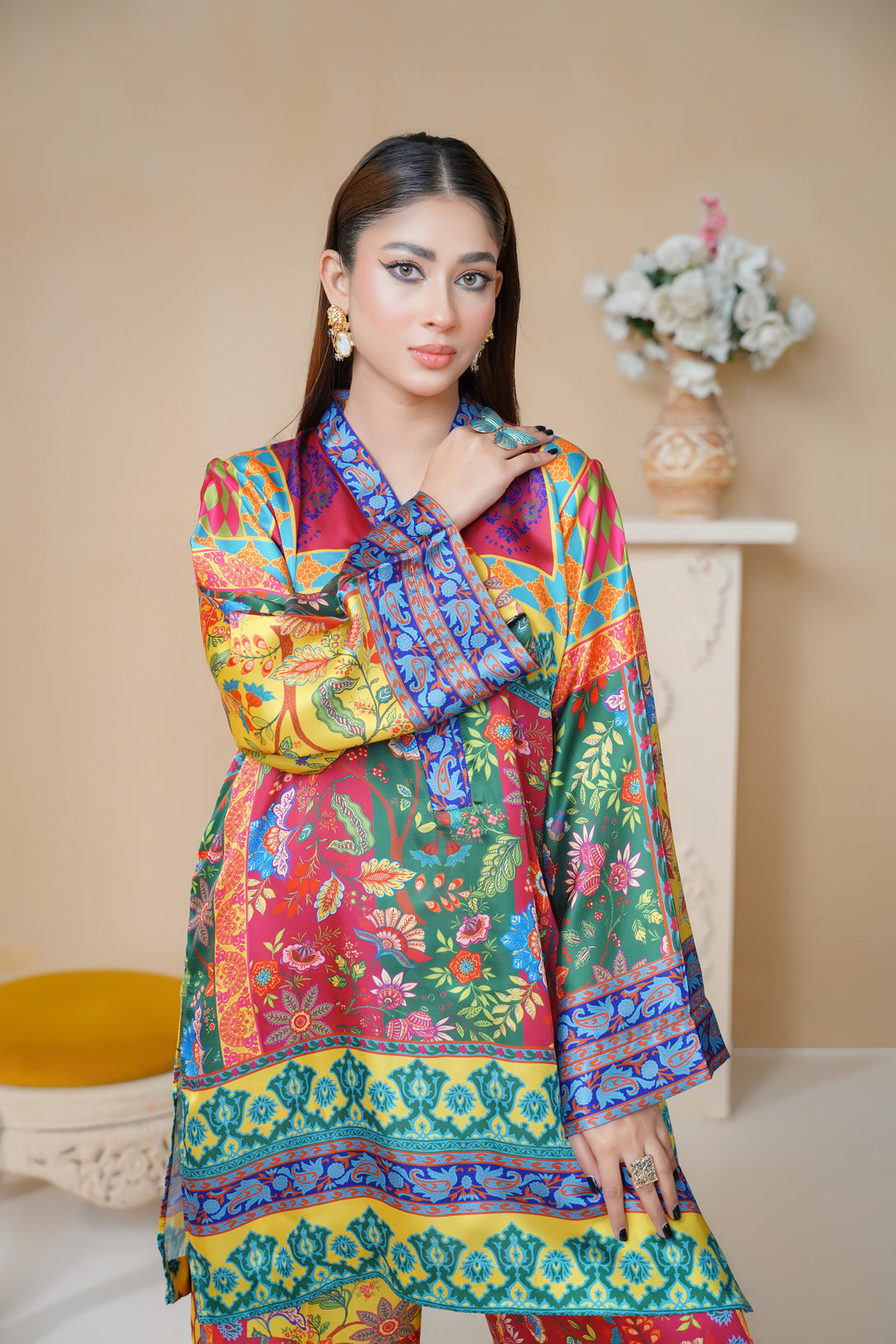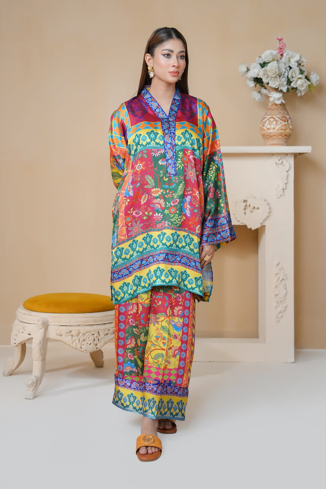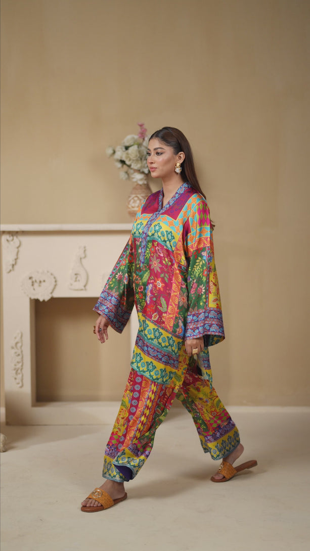 This stunning two-piece print suit captivates with its intricate embroidery and rich Floral hues. The tunic flows gracefully, featuring a mix of floral and geometric patterns. Paired with matching trousers, it’s an ideal outfit for casual and festive occasions alike.