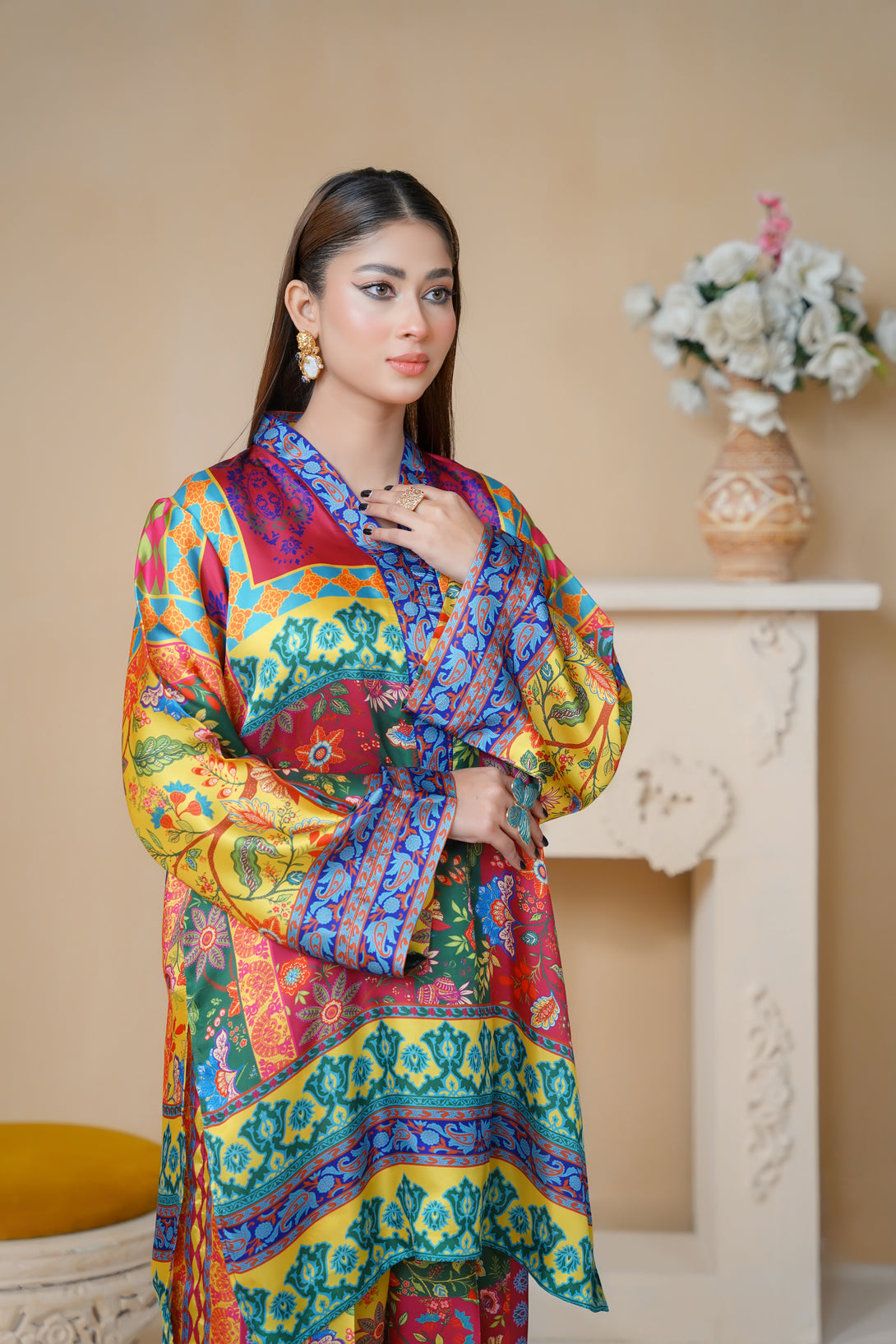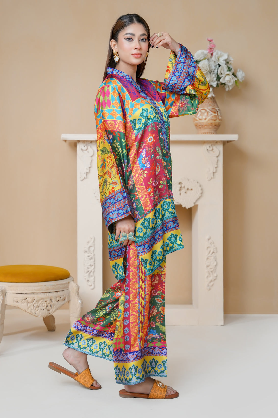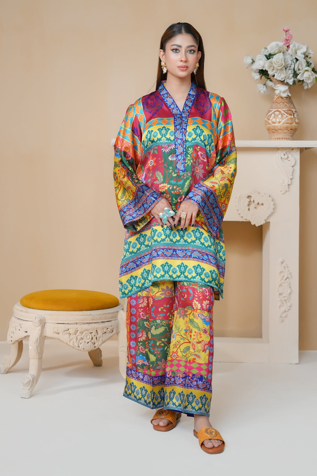 This stunning two-piece print suit captivates with its intricate embroidery and rich Floral hues. The tunic flows gracefully, featuring a mix of floral and geometric patterns. Paired with matching trousers, it’s an ideal outfit for casual and festive occasions alike.