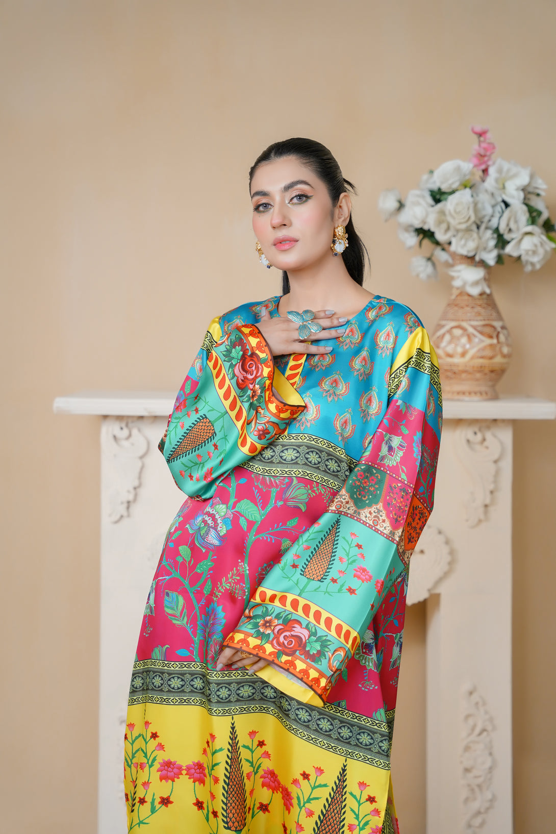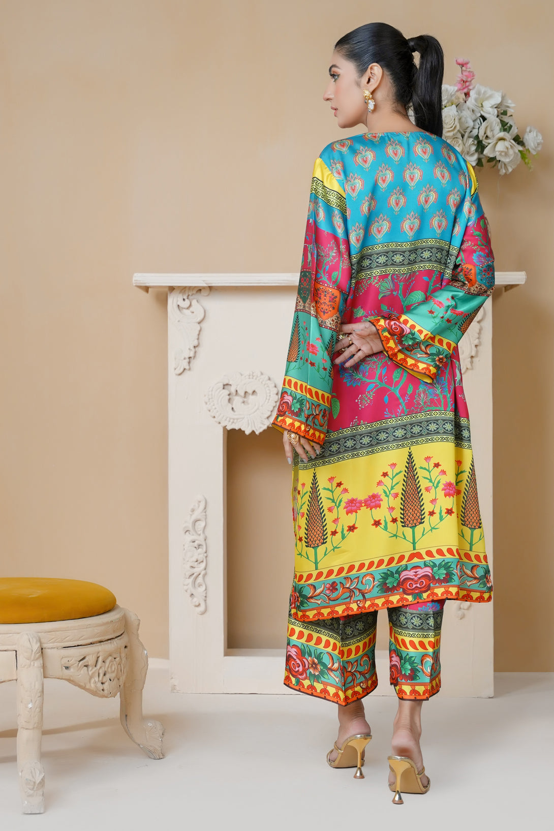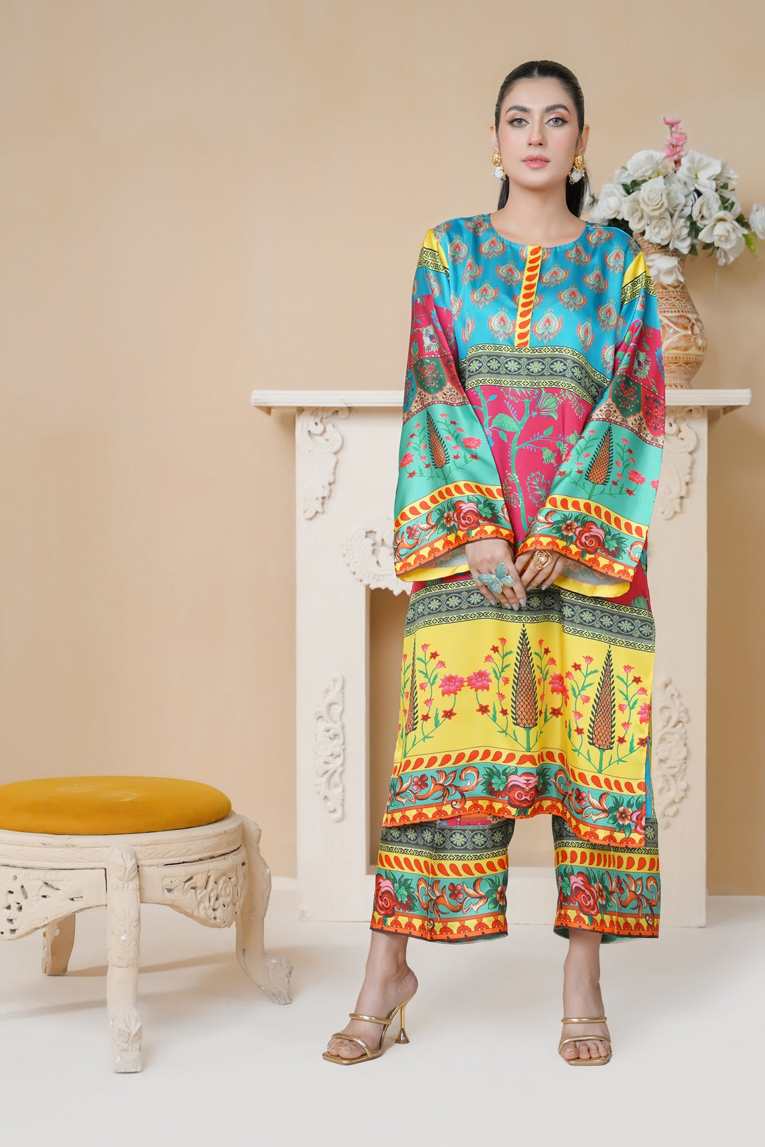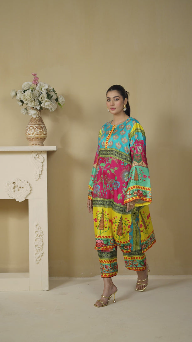 A charming ensemble in Multicolored, this two-piece print suit is designed with a blend of bold prints and delicate details. The asymmetrical hemline of the tunic adds a touch of contemporary style, while the wide-leg trousers ensure comfort with elegance. Perfect for any occasion!