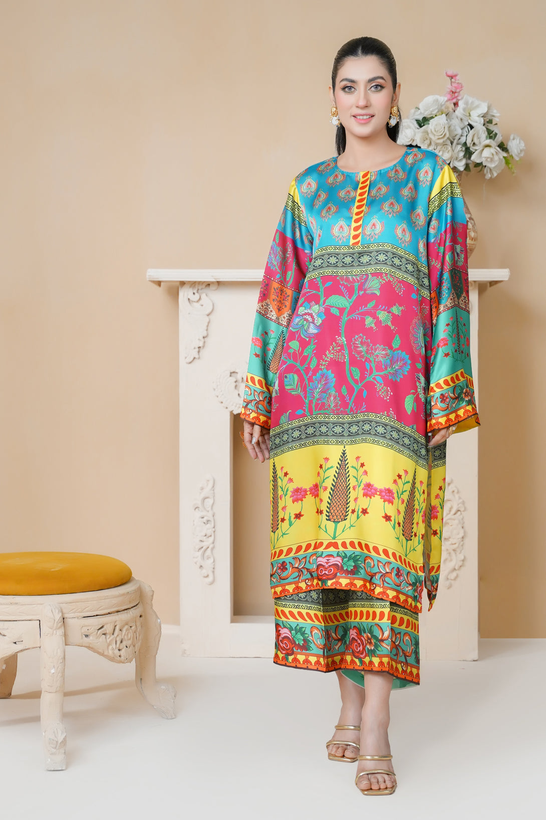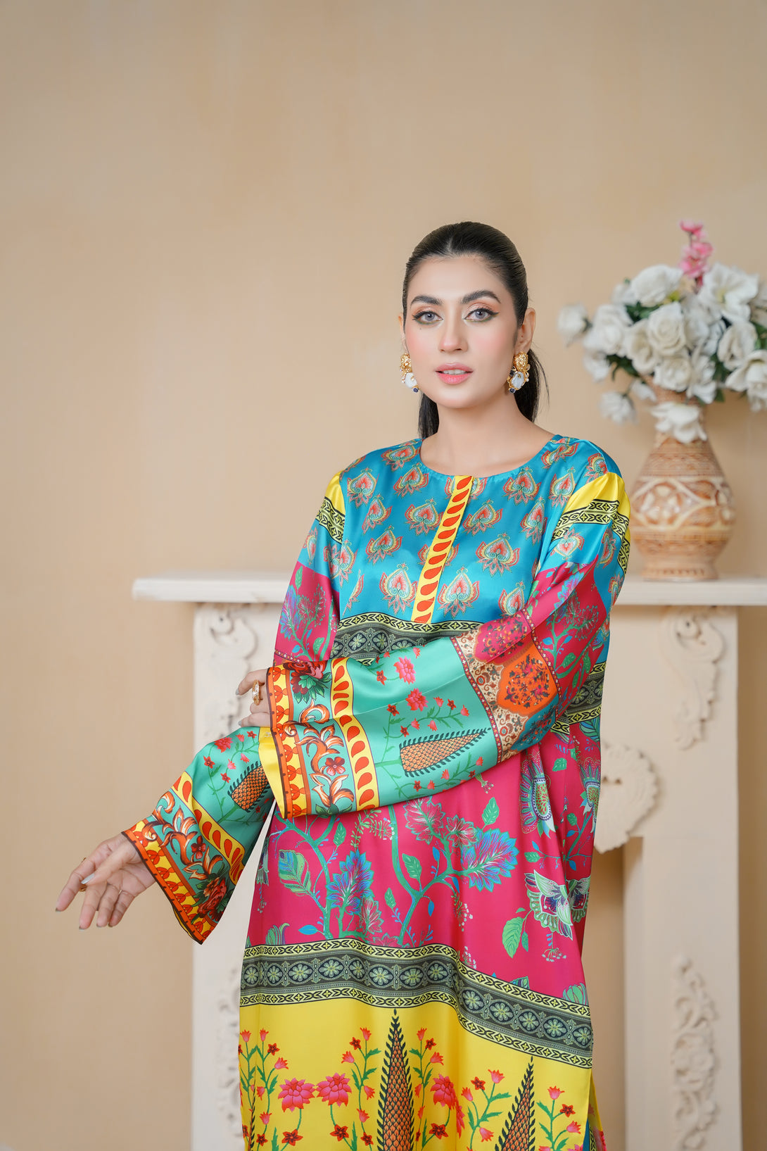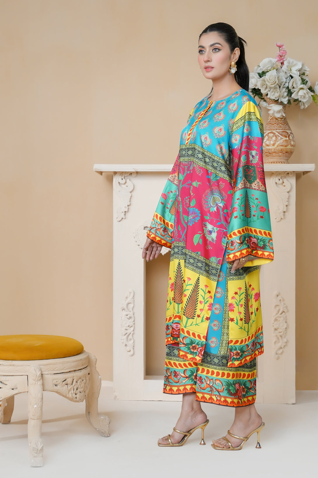 A charming ensemble in Multicolored, this two-piece print suit is designed with a blend of bold prints and delicate details. The asymmetrical hemline of the tunic adds a touch of contemporary style, while the wide-leg trousers ensure comfort with elegance. Perfect for any occasion!