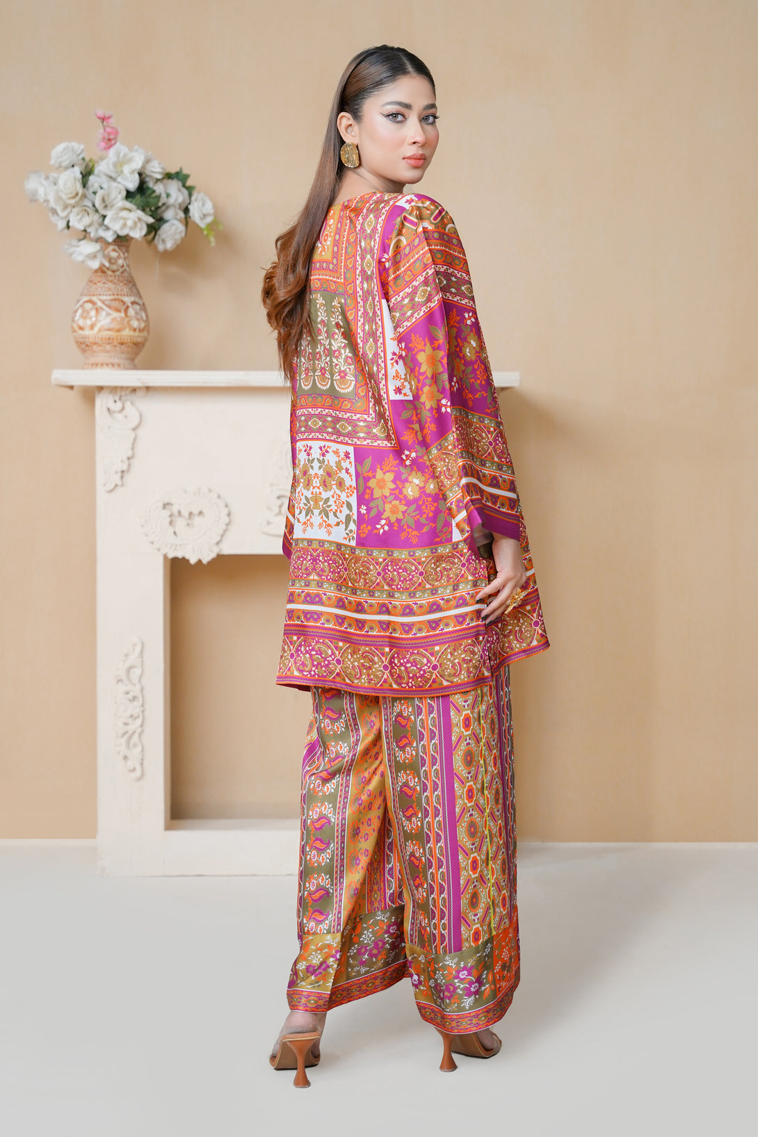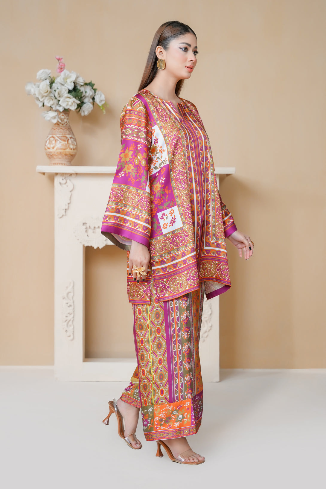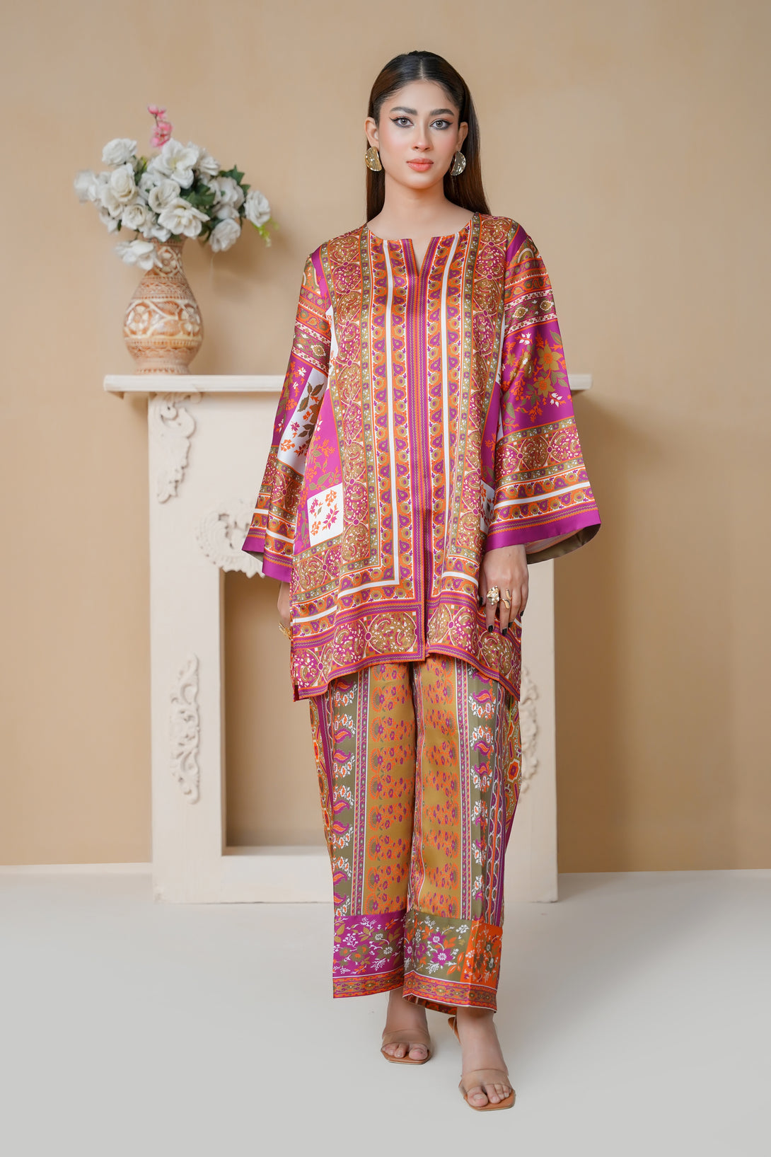 A beautifully crafted two-piece print suit in pink, adorned with artistic patterns and stylish cuts. The tunic’s relaxed structure and asymmetrical design make it a standout piece, paired with comfortable trousers for a well-coordinated look. Ideal for any occasion!