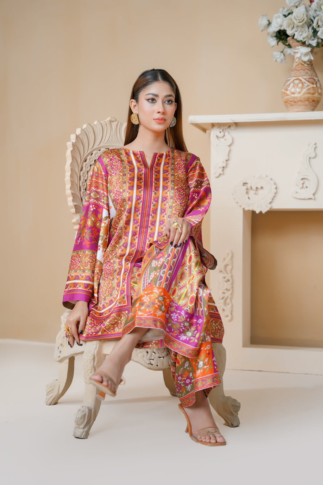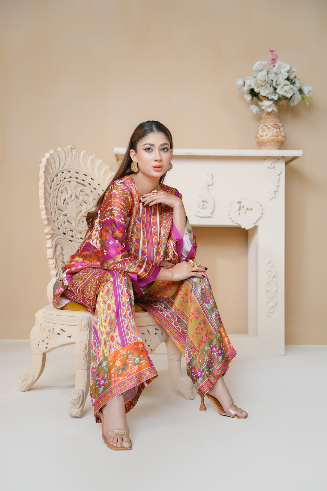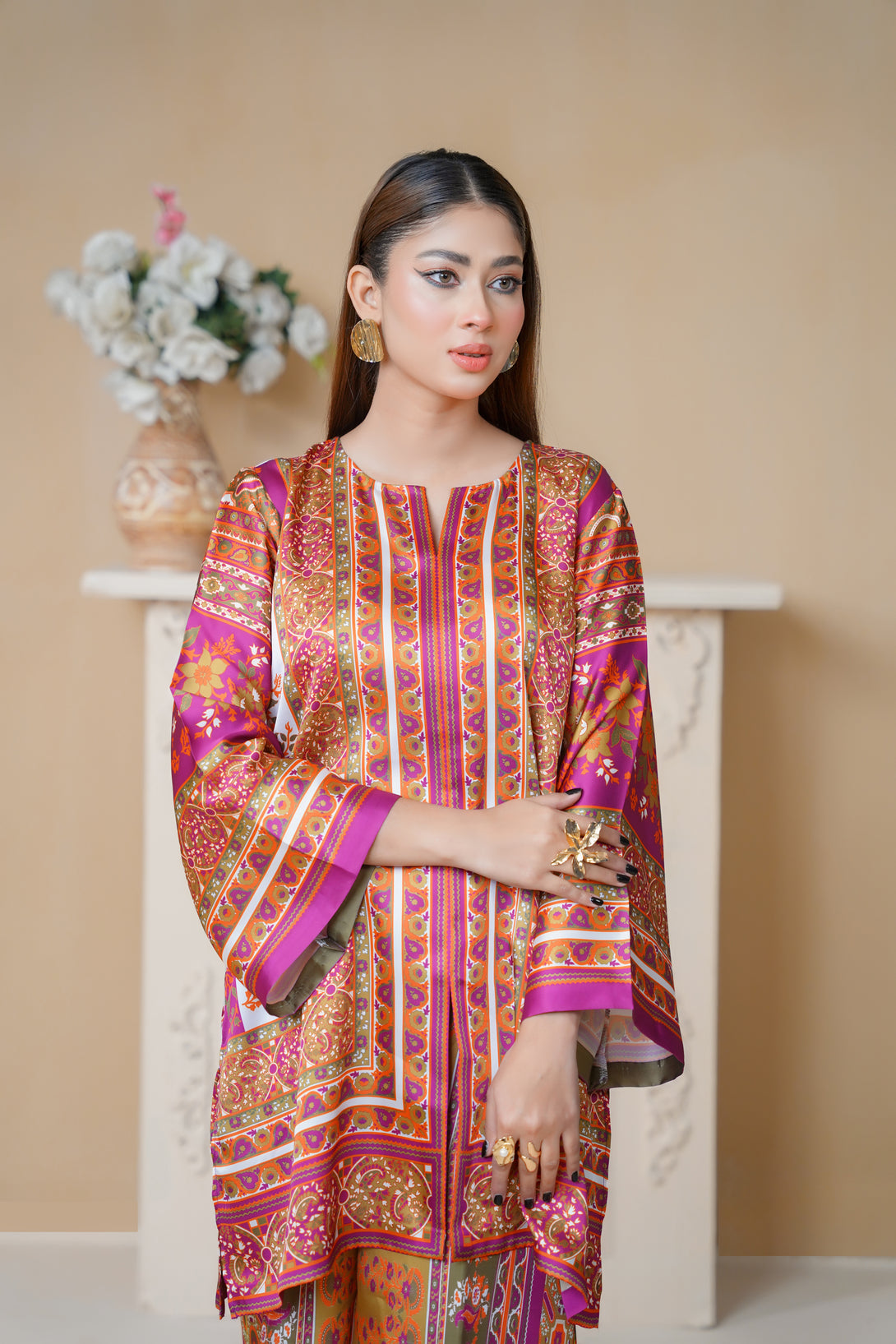 A beautifully crafted two-piece print suit in pink, adorned with artistic patterns and stylish cuts. The tunic’s relaxed structure and asymmetrical design make it a standout piece, paired with comfortable trousers for a well-coordinated look. Ideal for any occasion!