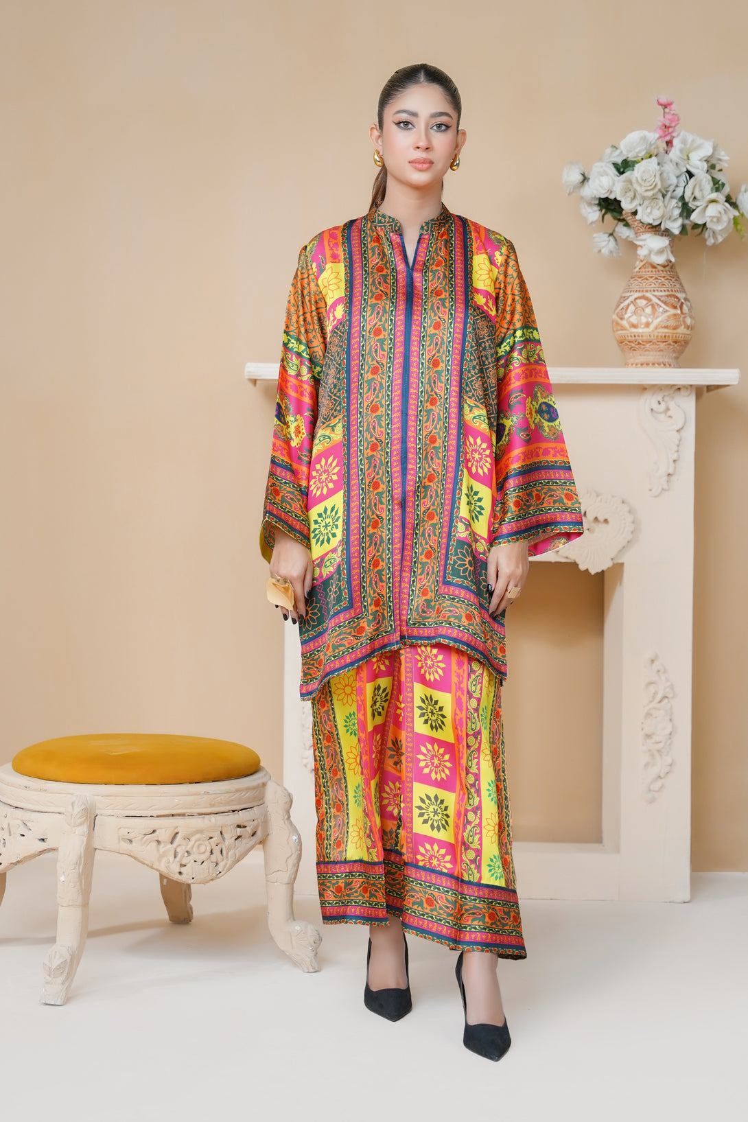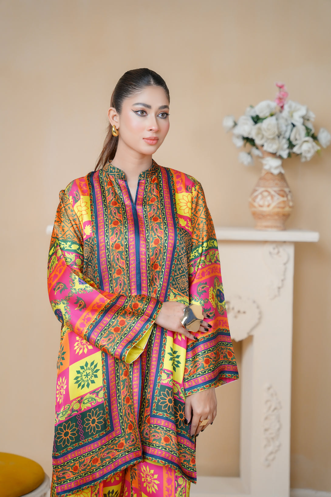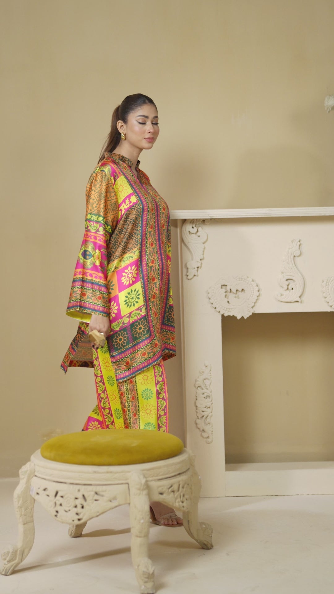 An eye-catching two-piece print suit in floral, featuring a beautiful blend of floral and abstract patterns. The tunic’s fluid cut enhances the overall elegance, while the tailored trousers complete the look with a polished finish. Ideal for any fashion-forward wardrobe!