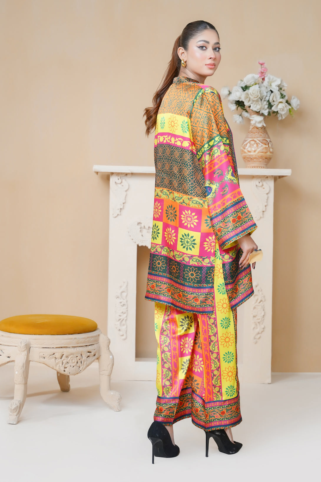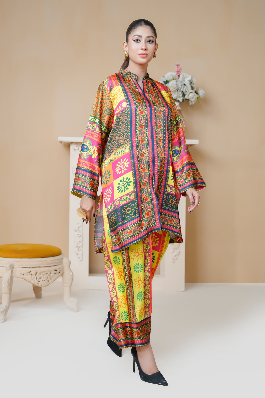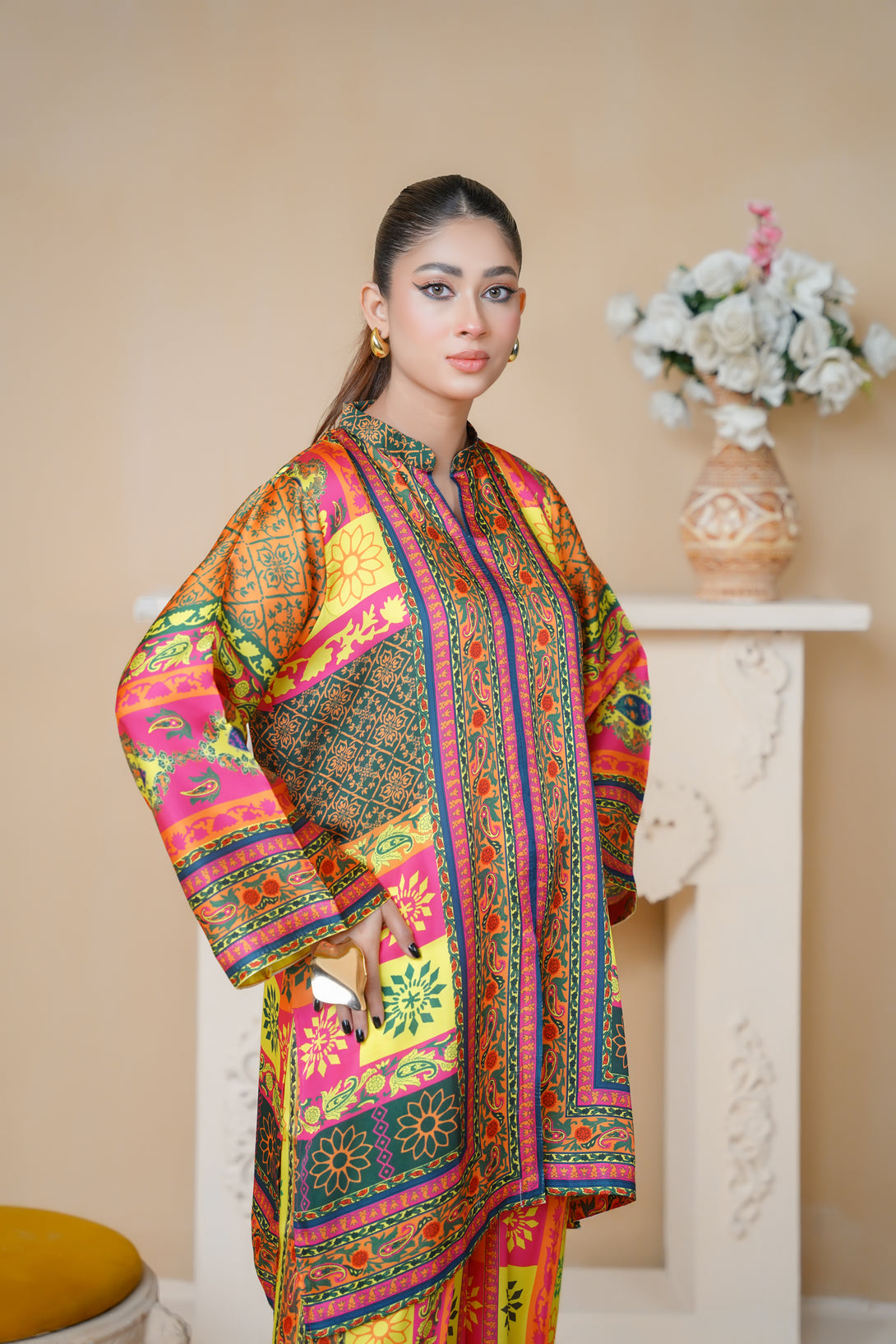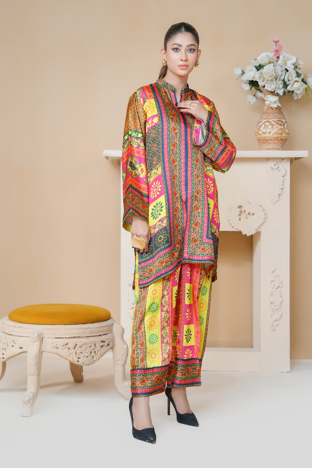 An eye-catching two-piece print suit in floral, featuring a beautiful blend of floral and abstract patterns. The tunic’s fluid cut enhances the overall elegance, while the tailored trousers complete the look with a polished finish. Ideal for any fashion-forward wardrobe!