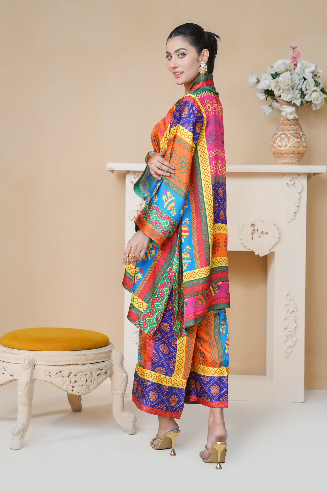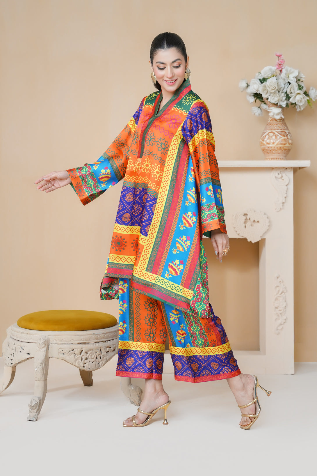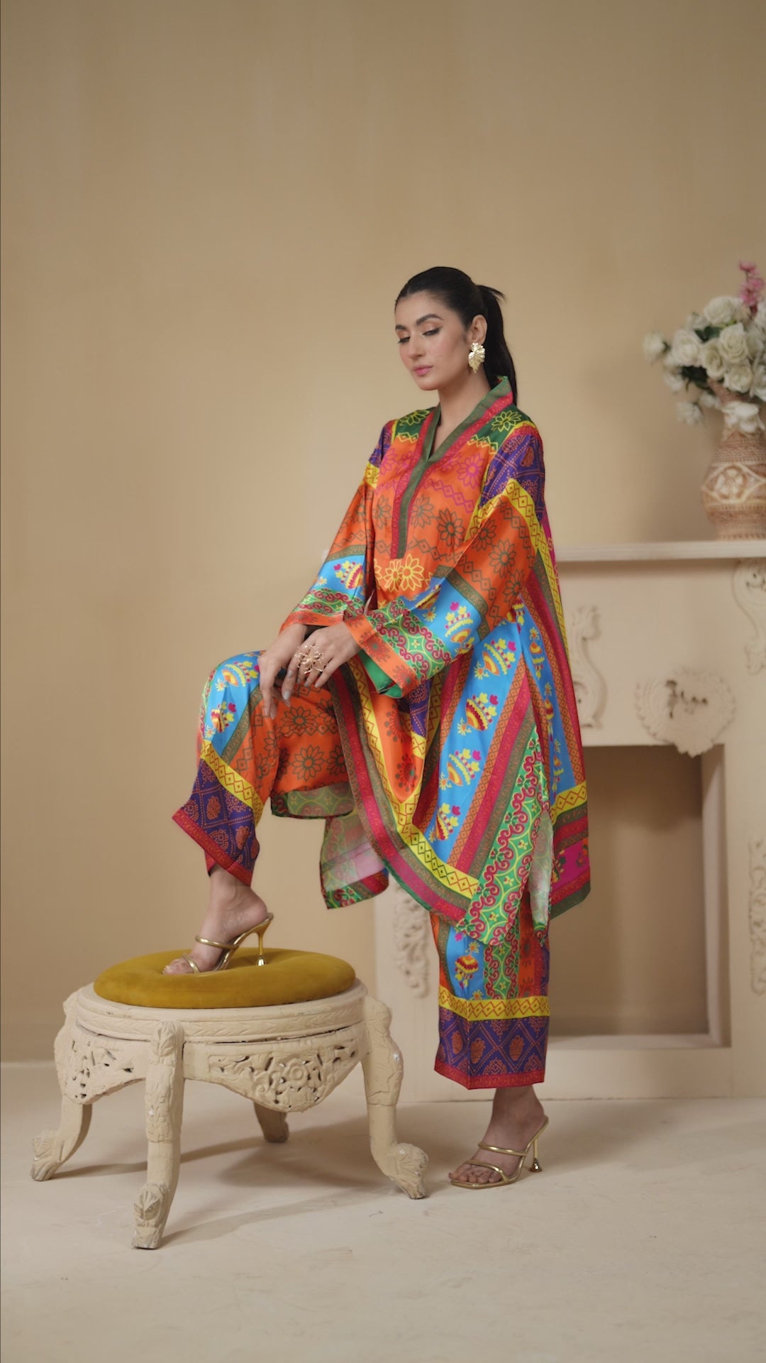 This chic two-piece print outfit in Multicolour showcases a mix of classic and contemporary aesthetics. The tunic is adorned with intricate detailing, giving it a regal yet effortless look. Teamed with matching trousers, this ensemble is a statement of style and grace.