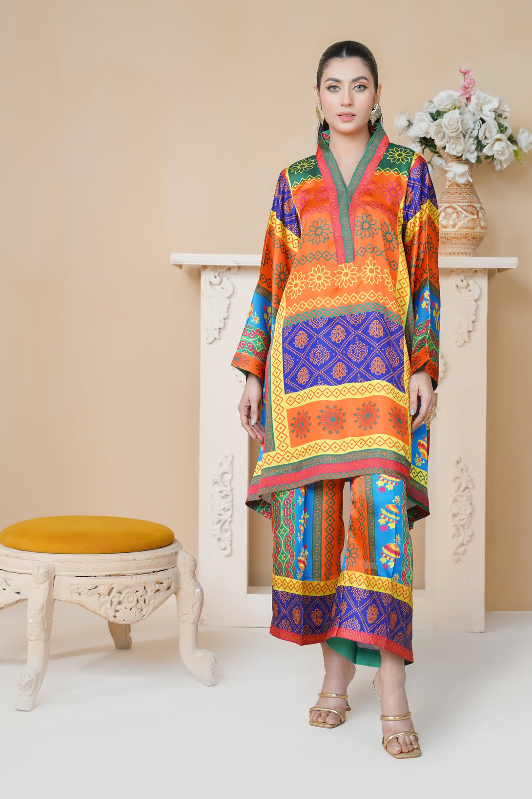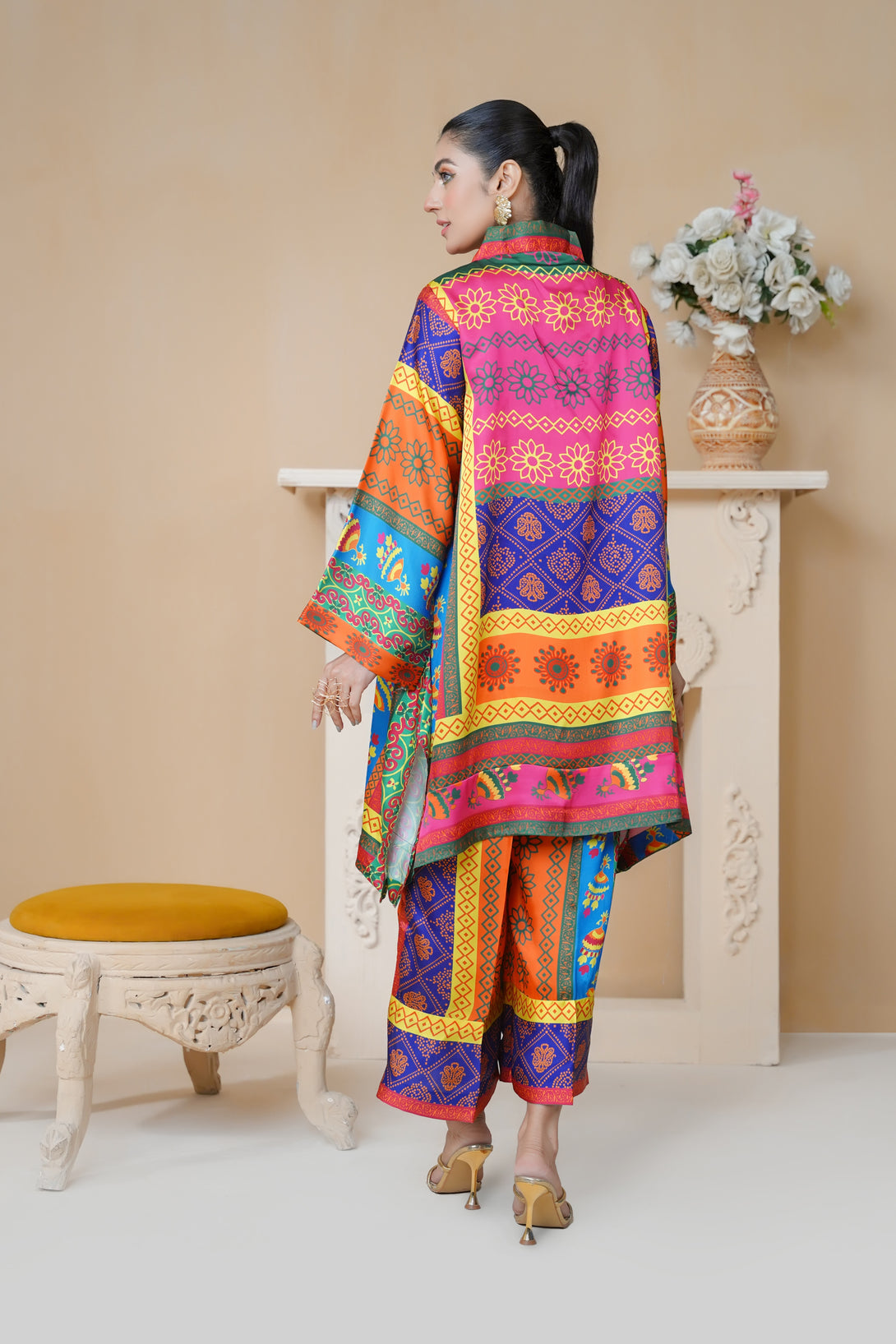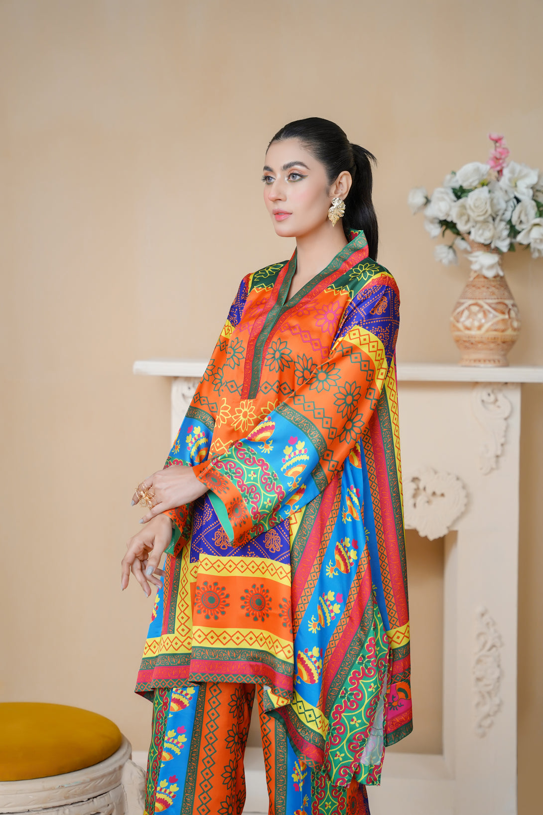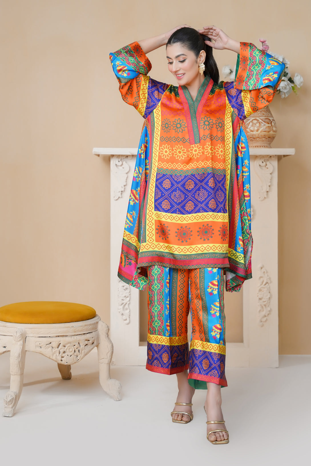 This chic two-piece print outfit in Multicolour showcases a mix of classic and contemporary aesthetics. The tunic is adorned with intricate detailing, giving it a regal yet effortless look. Teamed with matching trousers, this ensemble is a statement of style and grace.