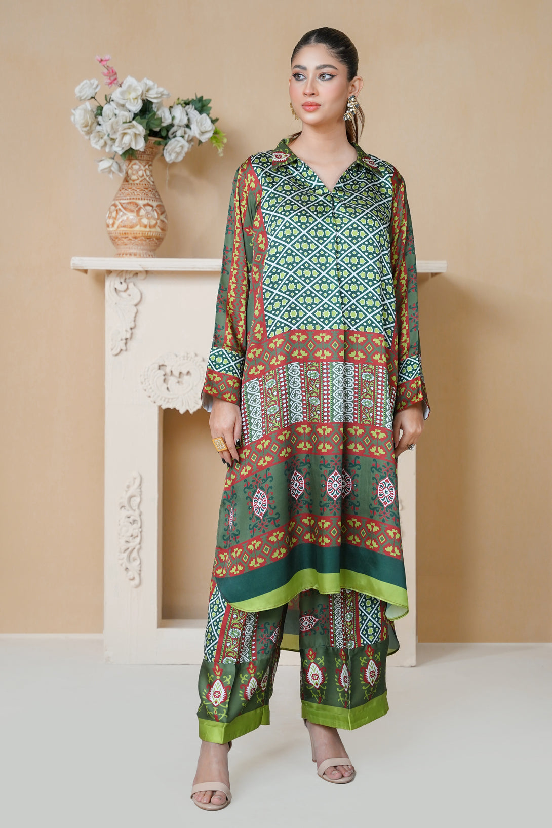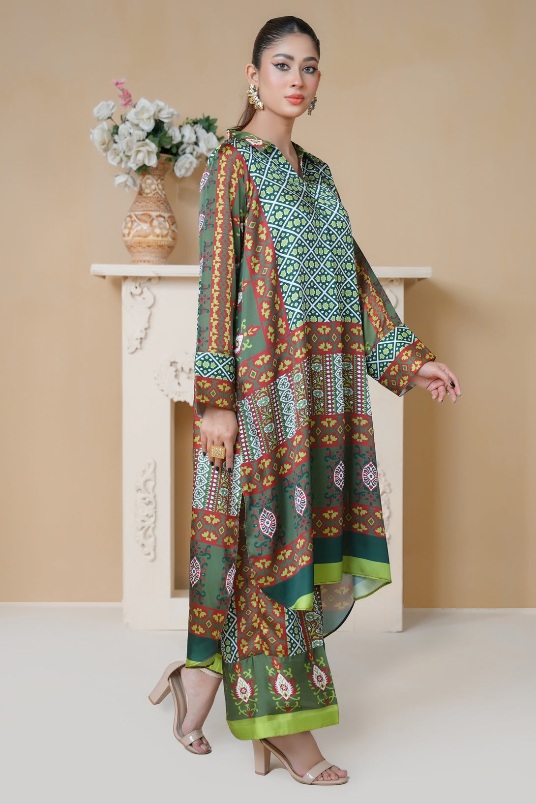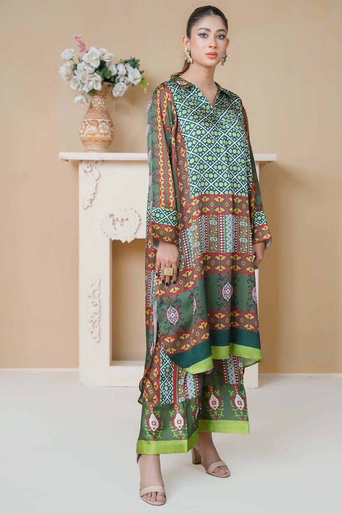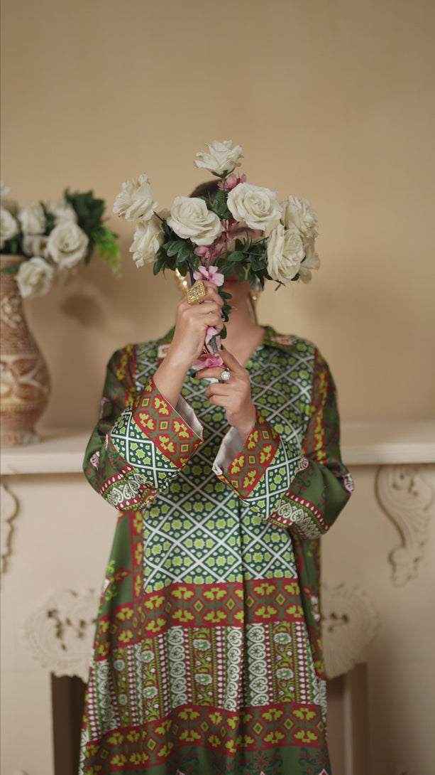 This two-piece print suit features a beautiful blend of intricate patterns and elegant details in Dark Green. The loose-fitted tunic drapes effortlessly, offering both comfort and sophistication. Paired with stylish straight-leg trousers, this ensemble is a perfect fusion of tradition and modern flair.