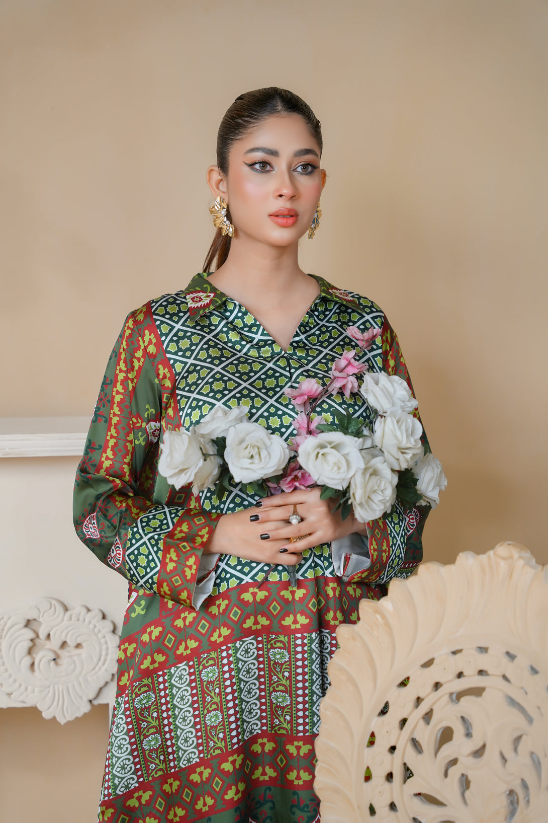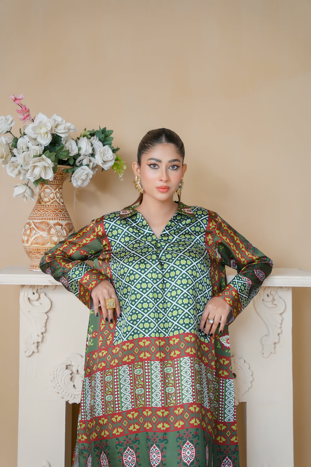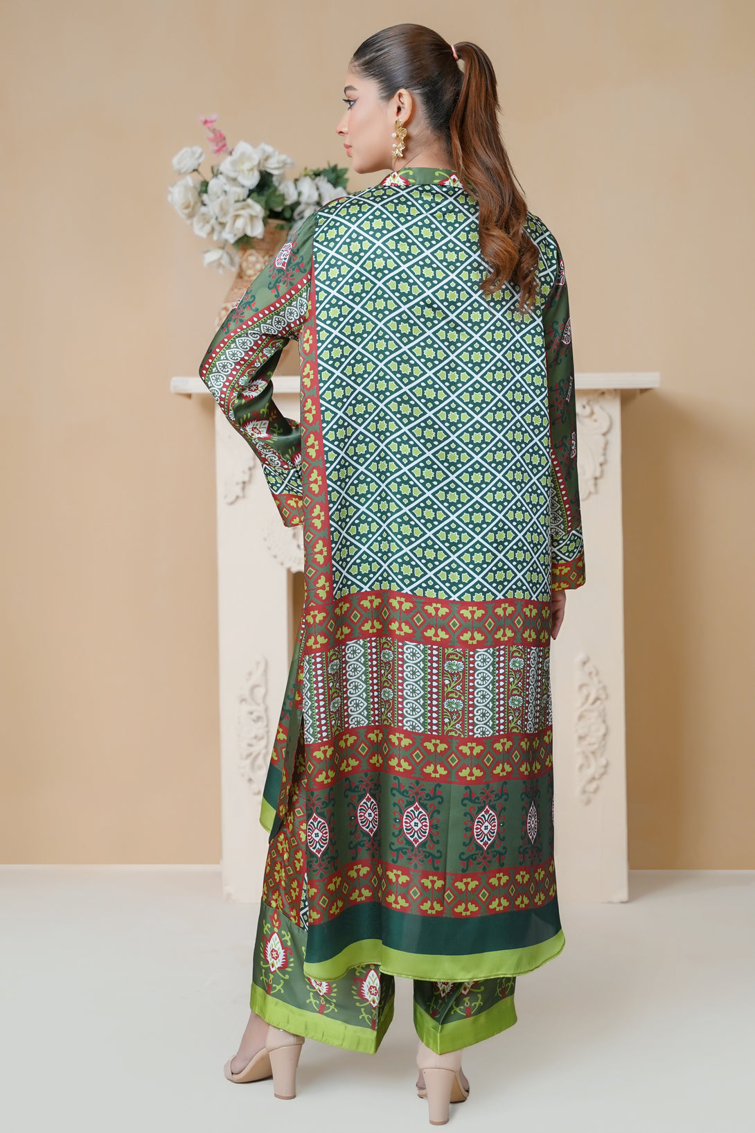 This two-piece print suit features a beautiful blend of intricate patterns and elegant details in Dark Green. The loose-fitted tunic drapes effortlessly, offering both comfort and sophistication. Paired with stylish straight-leg trousers, this ensemble is a perfect fusion of tradition and modern flair.