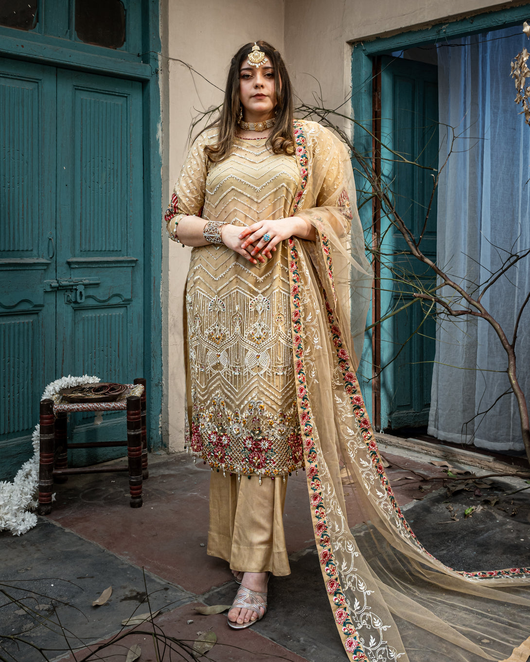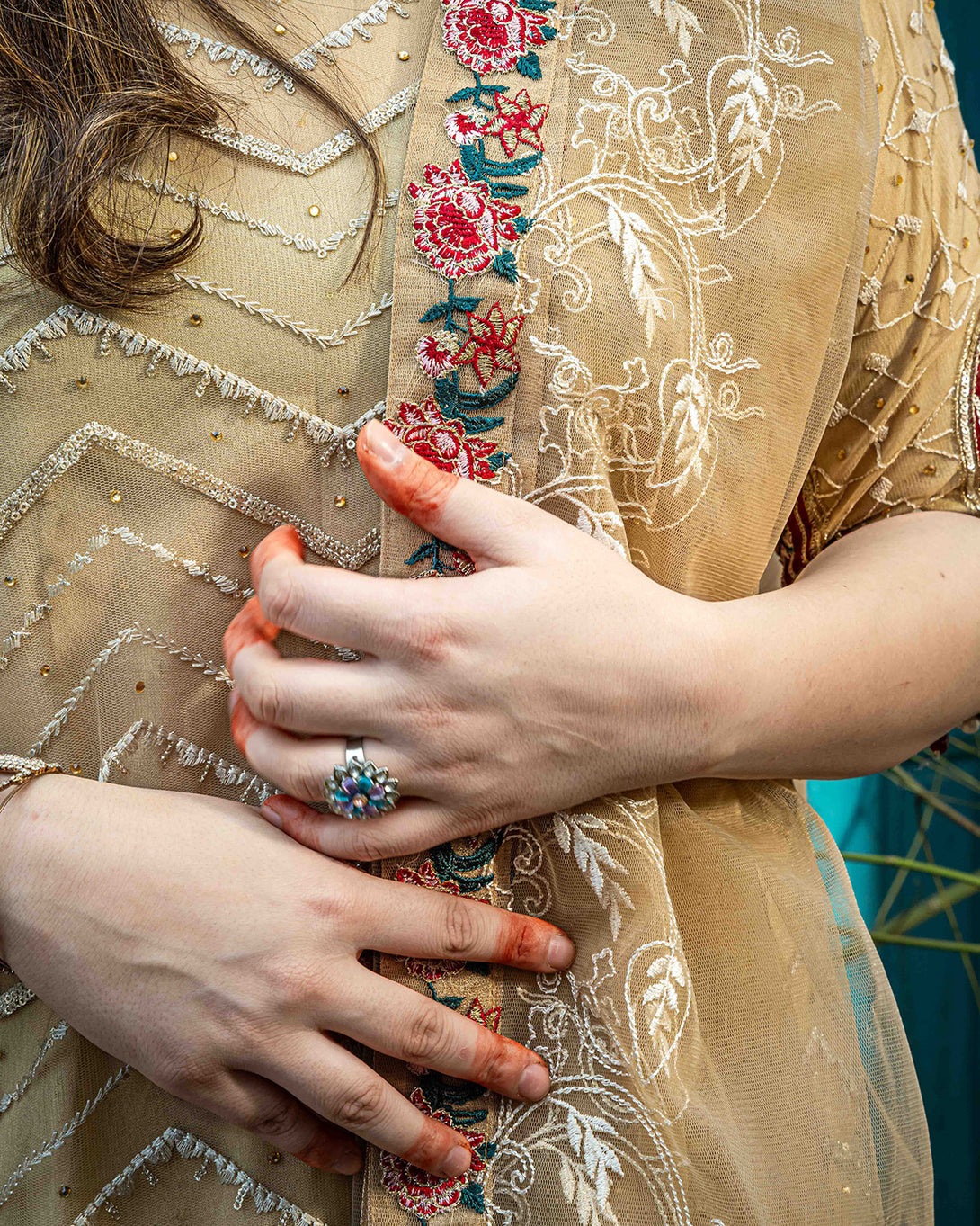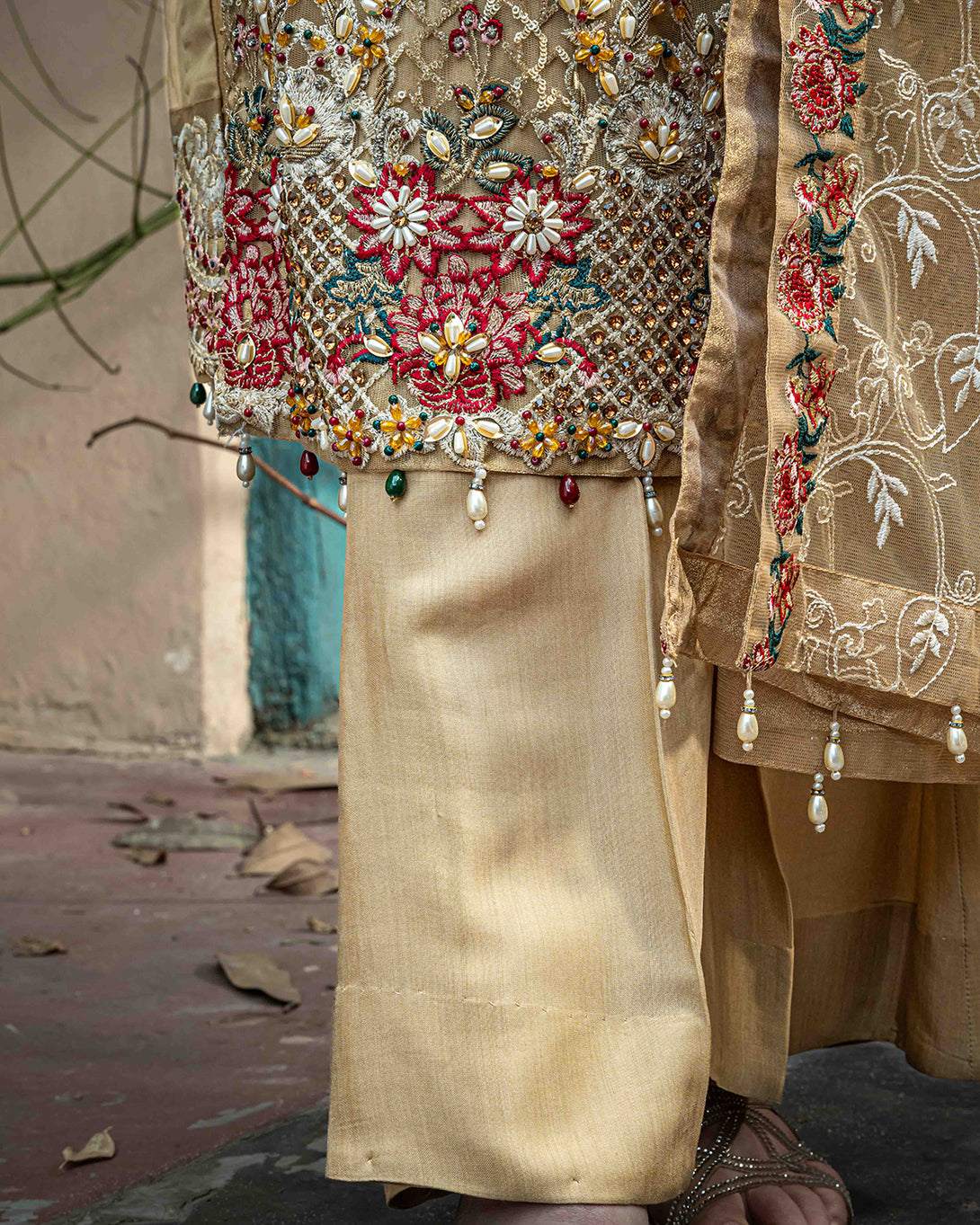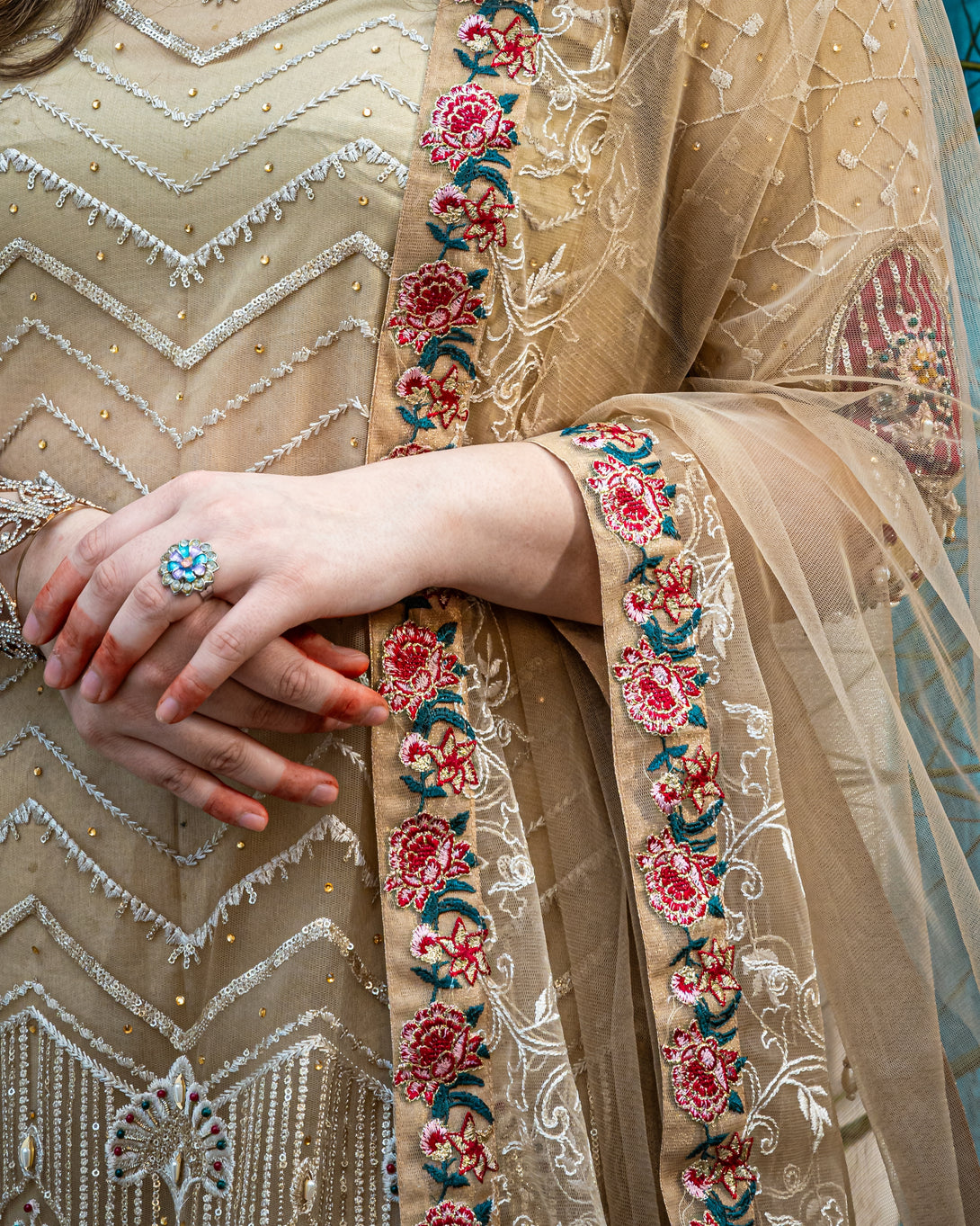 .Embroidered sleeves with heavy hand embellishment